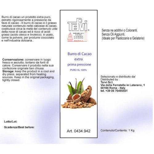 Burro di cacao un prodotto extra puro, estratto rigorosamente a pressione da fave di cacao - Il burro di cacao è il grasso naturale contenuto nelle cabosse di cacao, costituisce circa la metà del contenuto utile della noce di cacao ed è ricco di acidi grassi (acido oleico e linoleico). è usato, come la polvere, per produrre cioccolato e nell'industria dolciaria.Senza ne additivi ne coloranti, senza oli aggiunti . (ideale per preparazioni di gelateria o pasticceria )