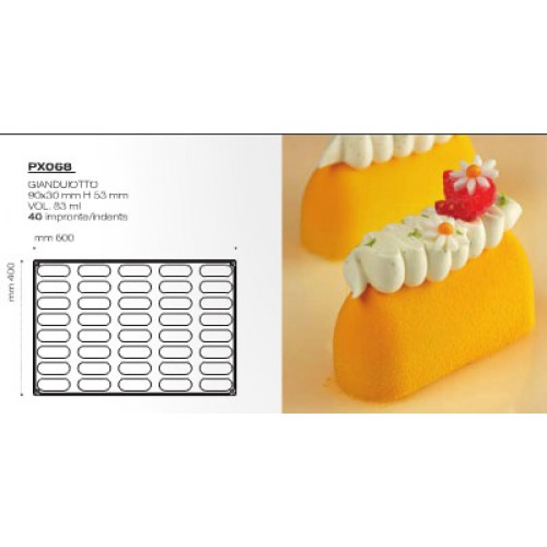 Stampo monoporzione gianduiotto 90x30 mm h 53 mm.Vol.83 ml - 40 impronte. dimensioni cm.60x40. Per uso professionale, ideali per esaltare la creatività e realizzare prodotti dolci e salati dal forte impatto. Grazie alla struttura flessibile, alle proprietà antiaderenti ed allo specifico effetto lucido delle cavità si possono realizzare con facilità anche i preparati più impegnativi. Questo stampo può essere impiegato sia per la surgelazione che per la cottura in forni ventilati, forni statici, o forni a microonde. Resistente alle temperature -40°C +280°C Conformi alle leggi internazionali che regolano l'utilizzo di materiali destinati al contatto alimentare.
