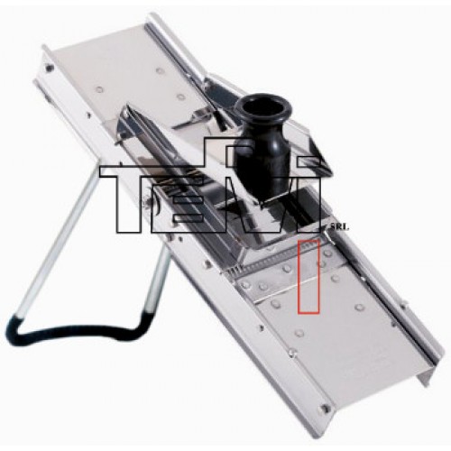 Mandolina taglia verdure Grand chef. Una mandolina professionale interamente in acciaio inox, viene fornita con 2 lame 3 pettini julienne da 2,4 6,4 e 10 mm. più un carrello scorrevole protettivo inox. Dimensioni 135x410x45 mm