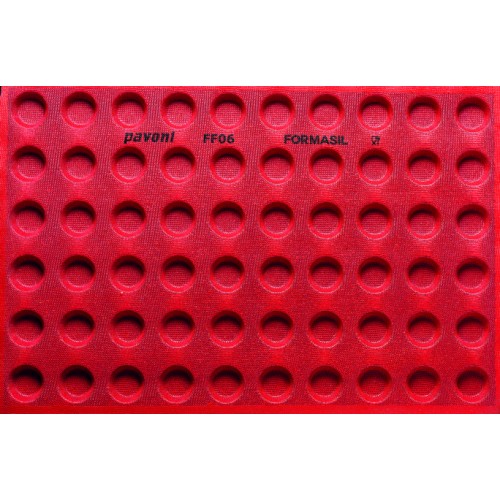 Stampi Microforati Formasil 600X400 "Pavoni" Stampo in silicone forato Questi stampi sono ideali per fare, tartellette, crostatine dolci o salate o pizzette. Grazie all'antiaderanza del silform non serve più nemmeno ungere gli stampi, il calore si diffonde uniformemente grazie alla texture traforata garantendo una qualità di cottura ottimale ed una croccantezza inimitabile foglio da cm. 60x40 forma tonda da mm.40x16h - 60 impronte ml.16