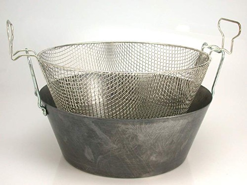 Padella in ferro per fritti con cestello in filo metallico. Quella in ferro è la padella più consigliata per friggere. Infatti il ferro è il materiale più adatto per raggiungere in tempi brevi alte temperature e tollerarle molto bene. Il materiale è molto resistente e di sicuro sarà una padella che resiste nel tempo. L’unica attenzione da avere è quella di non graffiarle con oggetti metallici e di mantenere la superficie intatta.
