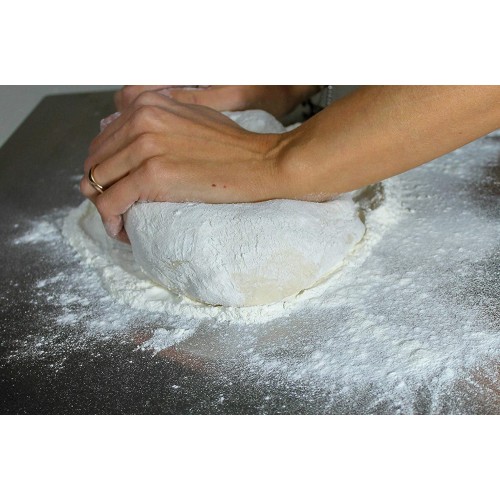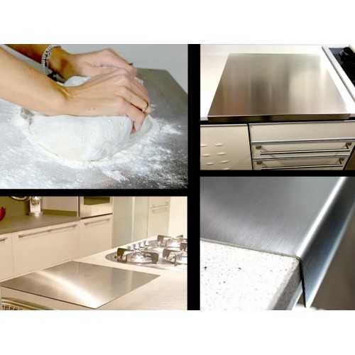 Piano da lavoro cm.50x48 con un design elegante, un lato a forma di L con piega da 2 cm per dare pregio estetico e sicurezza durante l'uso, Piano lavoro realizzato in Acciaio Inox Aisi 304 spessore 10/10 PRODUZIONE ITALIANA. Spianatoia per impastare professionale e di altissima qualità materiale lucido si può pulire semplicemente con acqua e sapone dopo l'uso. Ricordiamo che su richiesta possiamo eseguire il vostro piano da lavoro anche con misure personalizzate. Questa spianatoia è davvero utilissima per fare qualsiasi tipo di impasto. ideale per fare gli impasti di pane e pizza o dolci, essendo liscia è molto facile rimuovere eventuali residui di impasto e di farina. Inoltre va ricordato che non essendo porosa, come invece è il legno, non assorbe gli odori. È comodissima per rinfrescare il lievito madre, formare gli impasti ottima anche per "pirlare" gli impasti di lievitati come babà, colomba e panettone. Per i grandi lievitati è addirittura meglio del marmo perché priva di porosità.