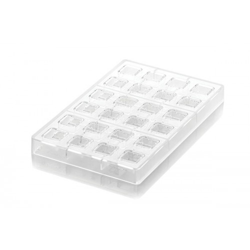 Il Kit per praline ripiene silikomart Quadro 01 è formato da uno stampo in tritan per dare la forma ai cioccolatini, con 24 impronte, ciascuna delle dimensioni di 25x25 H 16 mm; + N° 01 stampo in silicone per creare 24 inserti