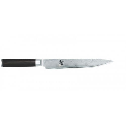 Coltello trinciante stretto Kay serie Shun Classic lama cm.23, impugnatura cm.12,2 La serie dei coltelli Shun appartiene alla gamma dei coltelli damascati e riscuote grande successo presso l‘élite culinaria e gli ambiziosi cuochi professionisti. I coltelli professionali Shun sono realizzati con uno strato interno in acciaio VG MAX estremamente resistente alla corrosione, molto duro (61±1 HRC, 1,0% di carbonio, 1,5% di cobalto) che mantiene la lama sempre affilata in modo ineguagliabile. La parte esterna delle lame è realizzata in acciaio inossidabile damascato di nuova generazione, a 32 strati. Grazie alla superficie convessa della lama e all’affilatura manuale di ogni coltello Shun si ottiene un taglio incomparabile, che lascia scivolare il coltello anche attraverso gli alimenti più difficili da tagliare. Questo filo, abbinato con il peso bilanciato del coltello, consente di lavorare senza fatica. Le venature del damasco conferiscono ad ogni coltello SHUN un carattere speciale così che ciascun coltello diviene un pezzo unico – un‘opera d‘arte che racchiude in sé artigianato, tecnica e design. La tecnica di lavorazione del coltello da cucina Shun nasce dall‘arte dei fabbri giapponesi delle spade dei samurai adattando la produzione delle lame allo stile occidentale offrendo così, anche ai cuochi europei, le forme a loro familiari realizzate con la qualità tradizionale giapponese.I coltelli Shun non sono lavabili in lavastoviglie e devono essere lavati a mano e subito asciugati. Consiglio: quando la lama comincerà a perdere la sua affilatura dovrebbe essere solamente affilata con una pietra affilacoltelli o con un utensile (non con un acciaino).