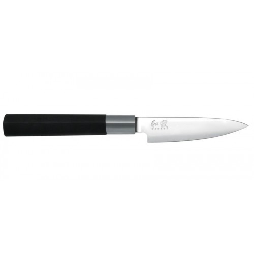 Coltello universale cm. 10 piccolo e manegevole, ottimo per la lavorazione di frutta e verdura, mondare carne o pesce, sezionare volatili - I coltelli Kay della linea Wasabi Black, devono la loro fama alla lama tagliente come l'omonimo rafano giapponese. Lama liscia, manico nero - questi sono i coltelli della linea Wasabi. Inventati in Giappone, i coltelli presentano, nella forma e nella qualità delle lame, le caratteristiche dell’estremo oriente. Le lame lisce in pregiato acciaio inossidabile presentano una durezza di 58±1 HRC e un’affilatura su entrambi i lati - ll manico lungo 12,6 cm è stato appositamente creato per la linea Wasabi.