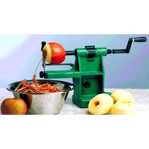 LE REGOLAZIONI: possono essere fatte in base alla mela utilizzata e alle esigenze dell'utente. LO SPESSORE della Buccia: Allentare la manopola zigrinata e regolare lo spazio tra la lama circolare. Più sarà grande il divario più sarà alto lo spessore della buccia. La PRESSIONE della sbucciatura: la pressione del pelamele può essere regolata in base al frutto. Rimuovere la molla dalla vite. Girare la vite di regolazione della pressione in senso orario per aumentare la pressione e in senso antiorario per diminuirla. MANUTENZIONE: per un'efficienza ottimale, consigliamo di lavorare con i coltelli affilati per spellare e affettare. Questi coltelli sono disponibili come parti di ricambio, Dopo l'uso, pulire la macchina in acqua contenente disinfettante. È possibile lavarla anche in lavastoviglie. Non pulire con solventi. Ideale per qualsiasi tipo di frutto rotondo. Bucce, fette e torsolo in un'unica operazione. Produce solo fette spesse 1/8 ". Corpo in plastica composita Exoglass®.