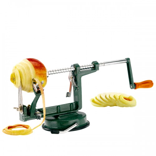 Il Pelamele sbuccia le mele di qualsiasi dimensione.Sbuccia, taglia e detorsola con un solo movimento. Dotato di ventosa che consente di fissarlo facilmente a qualsiasi superficie liscia.
