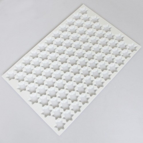 Placca taglia biscotti in plastica bianca per alimenti ideale per pasta frolla  - dimensioni della placca cm.58x39 - disegno geometrico stella da mm.35. Si tagliano in modo semplice e veloce 95 biscotti.
