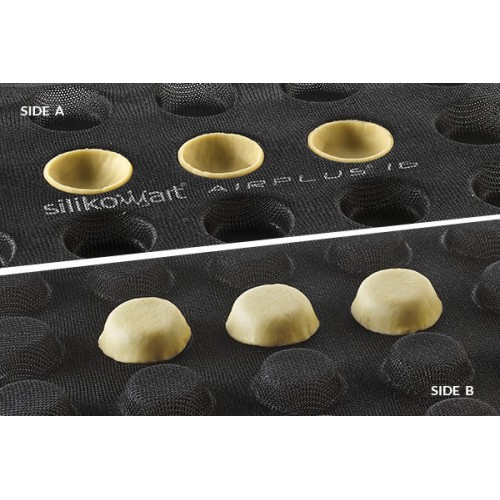 Stampi microforati in silicone e fibra di vetro ideali per la cottura. Questi innovativi stampi, grazie alla loro trama microforata, consentono una diffusione uniforme del calore, riducendo i tempi di cottura e garantendo un risultato perfetto. Ideali sia per creazioni dolci che salate. Sono perfetti per la creazione di frolle, prodotti lievitati (dolci da forno) e sfoglie. Gli stampi sono antiaderenti e possono essere utilizzati su entrambi i lati per preparare tartellette vuote o ripiene. Range di temperatura: -40°C +230°C
