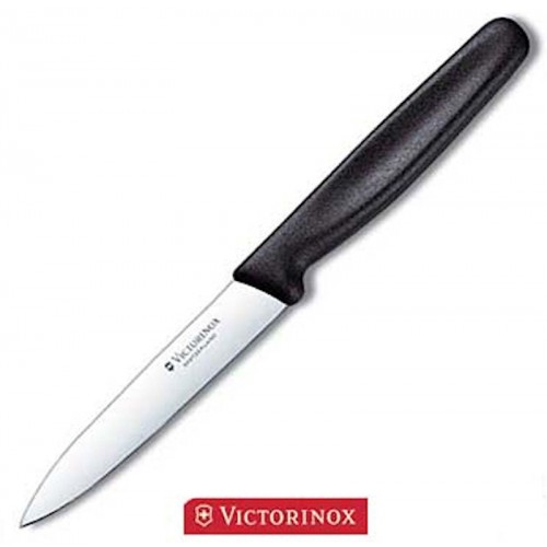 Coltello spelucchino dritto lama da cm.10 manico in nylon nero antiscivolo. I coltelli da cucina Victotinox sono stati ideati per affrontare qualsiasi cosa si trovi sul vostro tagliere. I loro manici ergonomici e il design bilanciato rendono il taglio leggero come un soffio di vento. Le loro lame sono sottili e affilate, per un taglio sottile come desiderate e preciso quanto vi serve. Carni di ogni taglio, frutta e verdura di ogni forma e dimensione: potrete affettare tutto con grazia e precisione. È per questo da sempre la Victorinox crea con passione i coltelli professionali, in modo ergonomico e incredibilmente affilati. Non importa se chi li userà sarà uno chef di un ristorante a cinque stelle o un appassionato nella sua cucina...tagliando, sminuzzando e affettando vi sentirete sempre professionisti.