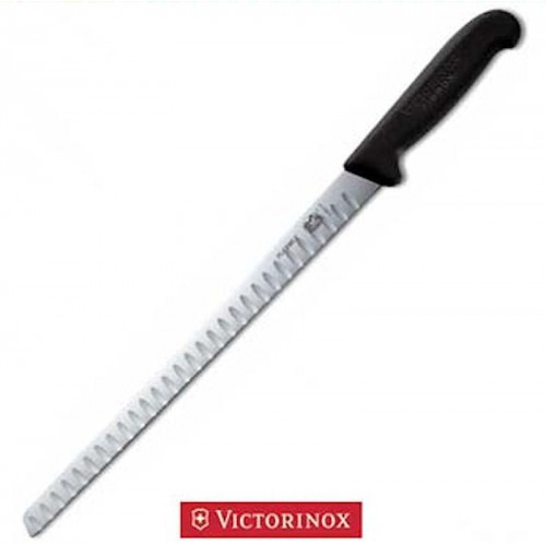 Coltello per salmone lama con affilatura ad alveoli flessibile da cm.30 manico in Fibox nero antiscivolo. I coltelli da cucina Victotinox sono stati ideati per affrontare qualsiasi cosa si trovi sul vostro tagliere. I loro manici ergonomici e il design bilanciato rendono il taglio leggero come un soffio di vento. Le loro lame sono sottili e affilate, per un taglio sottile come desiderate e preciso quanto vi serve. Carni di ogni taglio, frutta e verdura di ogni forma e dimensione: potrete affettare tutto con grazia e precisione. È per questo da sempre la Victorinox crea con passione i coltelli professionali, in modo ergonomico e incredibilmente affilati. Non importa se chi li userà sarà uno chef di un ristorante a cinque stelle o un appassionato nella sua cucina...tagliando, sminuzzando e affettando vi sentirete sempre  professionisti.