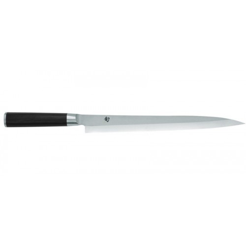 Coltello Kay pro Yanagiba lama da cm.27 impugnatura da cm.12,2 La serie Kay Shun PRO completa la collezione dei coltelli da cuoco Shun con lame ad affilatura asimmetrica di tradizione giapponese. Le lame sono interamente costituite in acciaio speciale VG-10. Questa qualità superiore di coltelli da cucina giapponesi è molto apprezzata dai professionisti del Sushi a livello mondiale e gode di una popolarità sempre crescente nella cucina europea. La lama affilata da un solo lato, dotata di una sagoma concava sul lato opposto, offre un taglio unico nel suo genere sconosciuto alla maggior parte degli Europei. Con ogni coltello come optional una pregiata custodia in legno per i coltelli Shun Pro, che garantisce una protezione ottimale delle lame.
